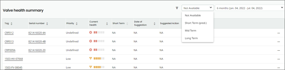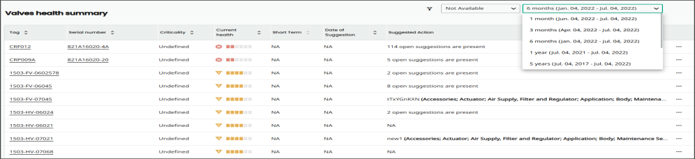 You can filter to view the Valve health summary table. You can choose from the kind of data to be displayed: