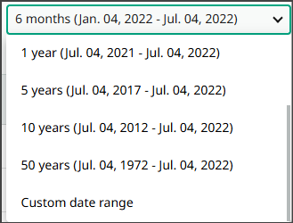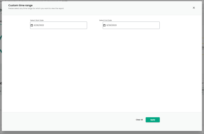 • Selecting Custom date range opens the dialog box, where you can select the start and end date and click Apply.