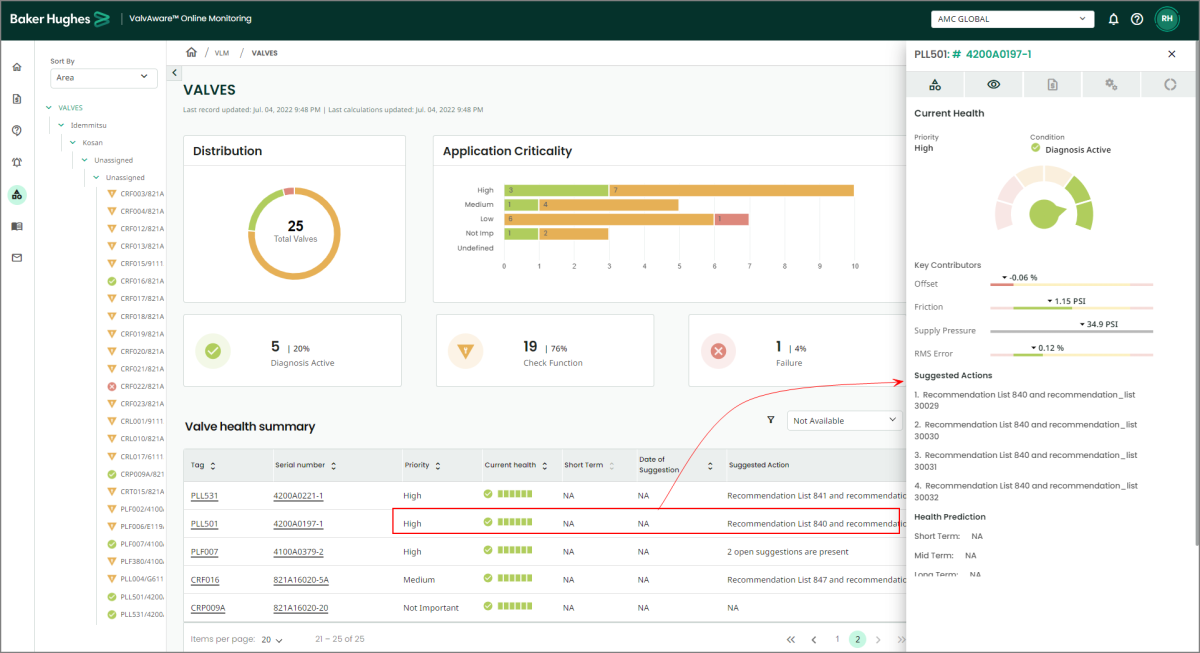 To take a quick look at the Valve Health Summary, click any item in the Priority through Suggested Actions columns, for that valve. A pane displays at the right that contains health summary of the selected valve.