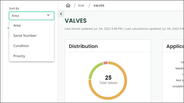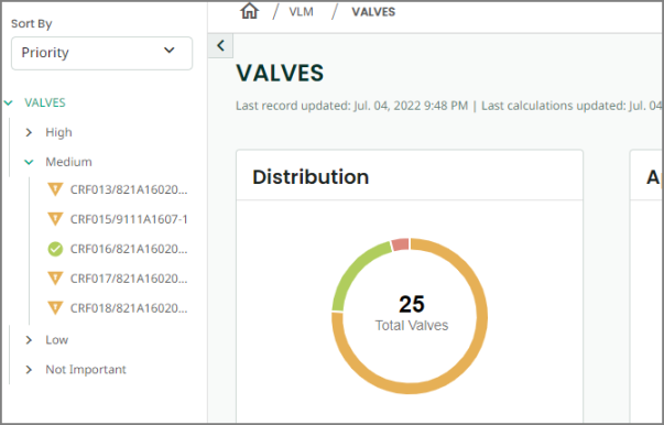 For example: On sorting by Priority, a list displays valves categorized under each priority–High, Medium, Low, and Not Important.