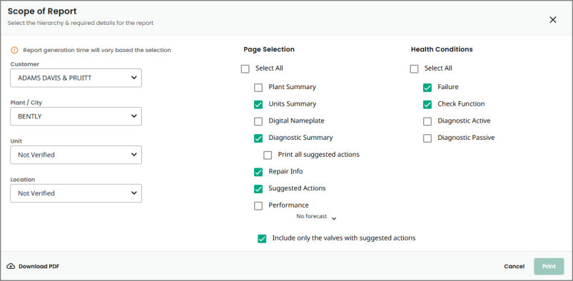 Note: If you select a hierarchy in the Valves pane, for example, a customer and plant, it will be pre-populated and you will not be able to select.